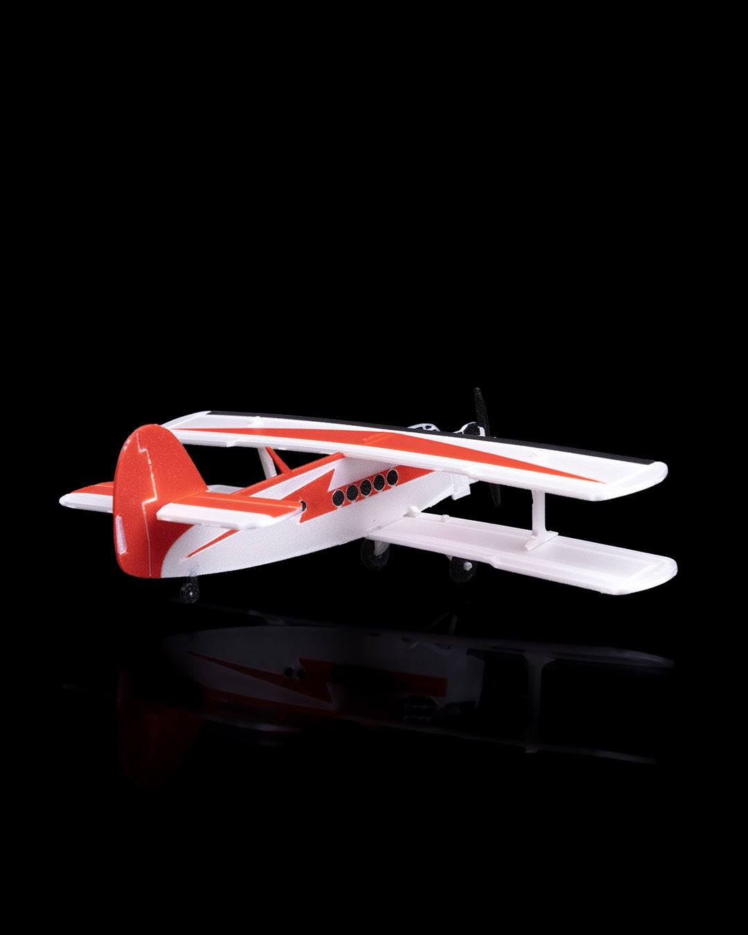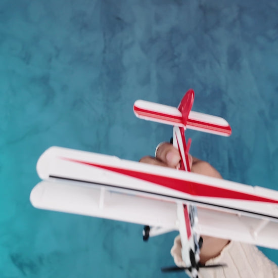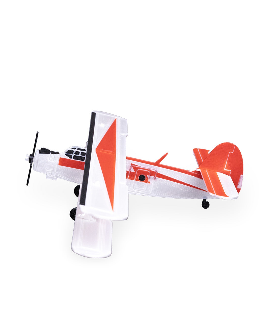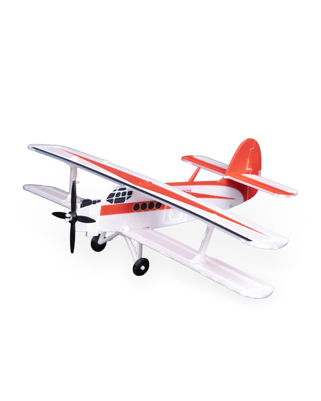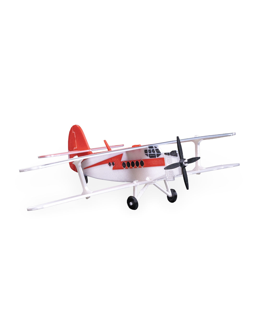 Biplanul „AN 2” impresionеază prin silueta sa caracteristică cu două aripi suprapuse, fuselajul robust și cabina deschisă evidențiată prin accente roșii și albe contrastante pe fundalul gri neutru. Detaliile trenului de aterizare, elicea frontală și forma ușoară, dar expresivă, redau autentic atmosfera aviației de epocă, în timp ce suportul elegant permite expunerea în orice unghi dorit.